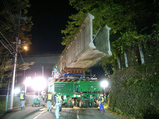昭和38年に地域の農業用導水路として建設されたが、その役目を終え、今回の撤去工事が施工された。当初設計においては、現道に防護工を施し、車両を通行させながらの施工が予定されていたが、当社での技術会議の結果、一般車両の安全と工期の短縮を検討し、(株)宇徳所有の次世代型特殊車輌であり導入は日本初だったスーパーキャリアを使用し、一晩で撤去した。